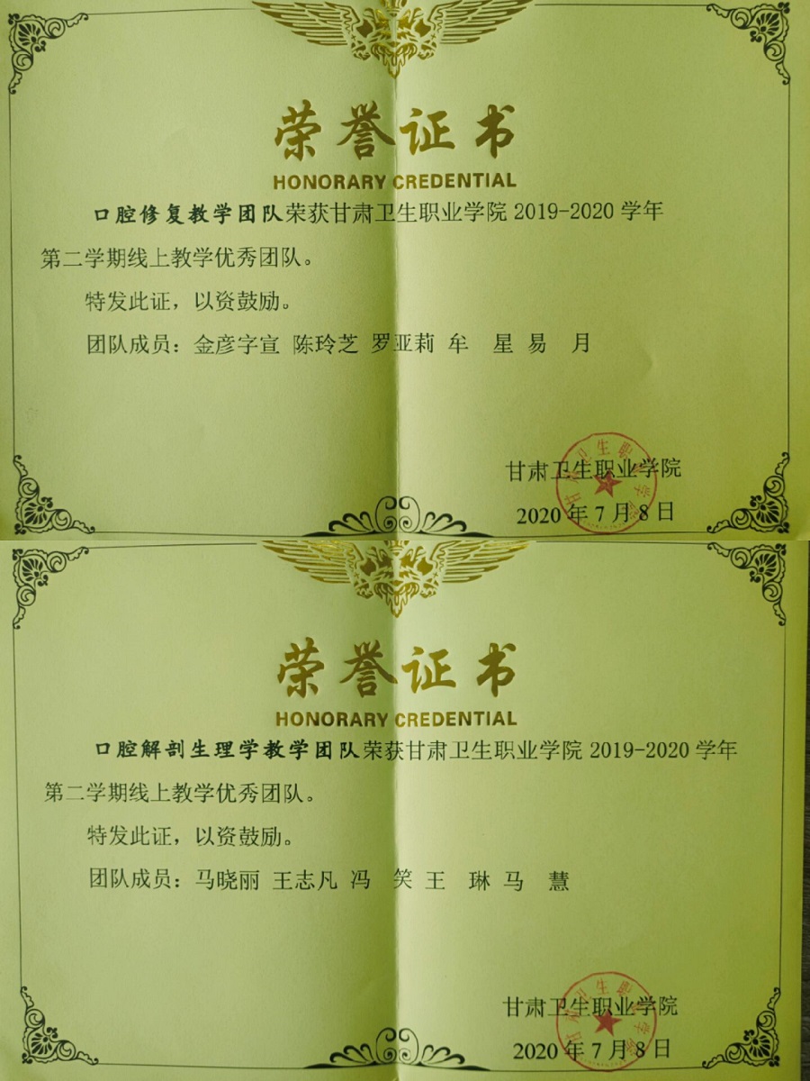 为落实学校《关于印发〈yl23455永利官网线上教学评优活动方案〉的通知》,经医学技术学院积极申报、教务处评审、校长办公会审议通过,医学技术学院被评为学校唯一的线上教学“优秀二级学院”,学院《口腔解剖生理学》教学团队、《口腔修复》教学团队被评为线上教学“优秀团队”,陈建国、郭艳玲、罗亚莉、张春雨4名教师被评为线上教学“优秀教师”。